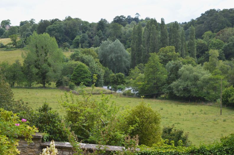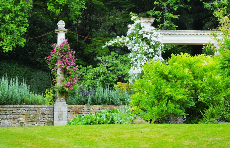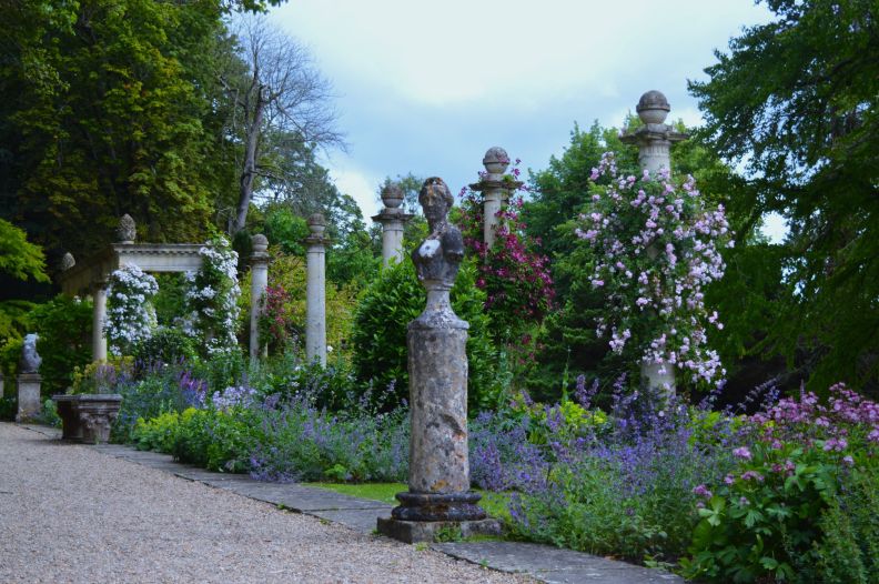 Roses and Clematis are carefully trained up Roman Tuscan columns with chain swags in between to frame far reaching views over the water meadows, the river Frome gliding smoothly within its banks at this time of year. Providing a tranquil and pastoral scene with sheep roaming just far enough away to be tasteful and not the messy, smelly, nightmare that they are up close!