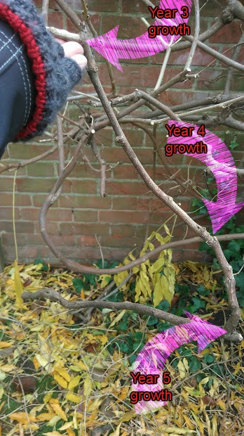 The 2 pics below show the length the the sideshoots were cut back to. Year 1 is where I pruned it back to and caused it to put out flowering sideshoots in the summer. Year 2 is where it was pruned to the year previous and so on. You can see why the winter prune as well as a proper summer prune is so important in these 2 pics as the total length over 6 years is quite significant and there is a lot of bare stem with no sideshoots producing flowers.